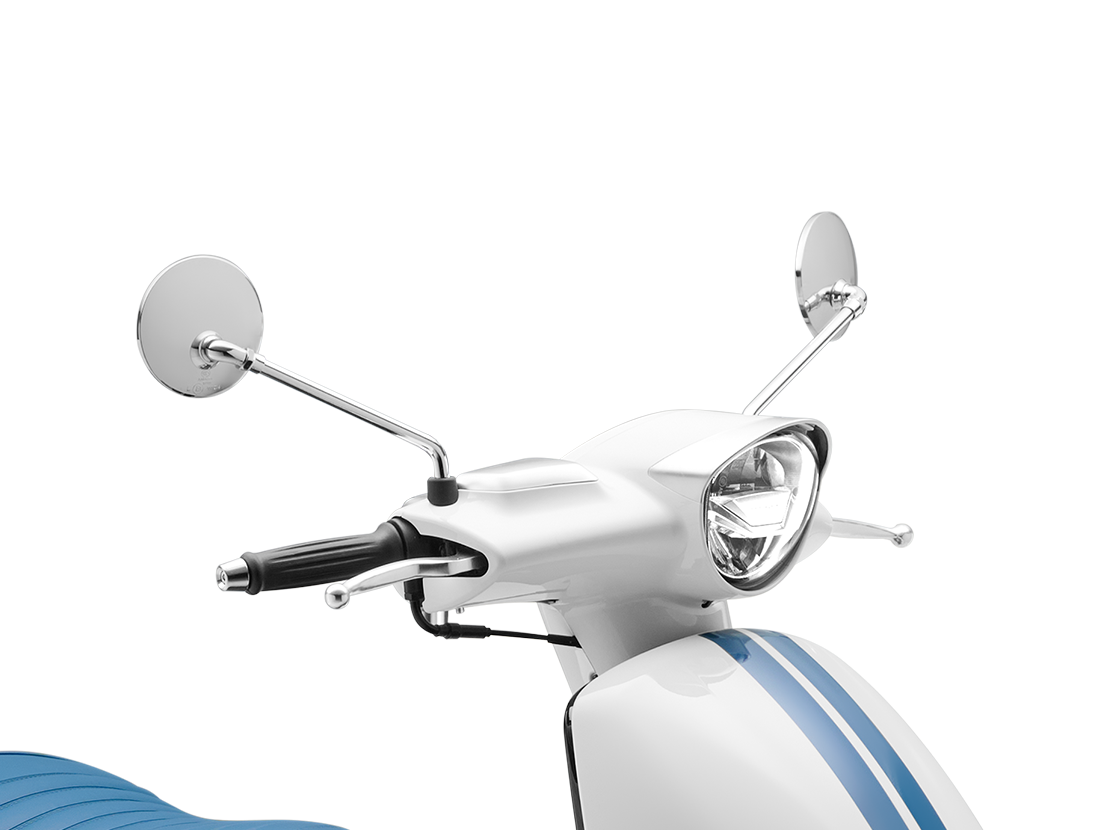 镀铬后扶手画龙点睛,匠心独具,为Django带来耀眼的复古风格,让外观更具魅力。反光镜光镜支架及车身加以镀铬处理,复古精致感油然而生,侧面保持圆润设计,镀铬条贯穿整个车身,上下车身层次感立显。